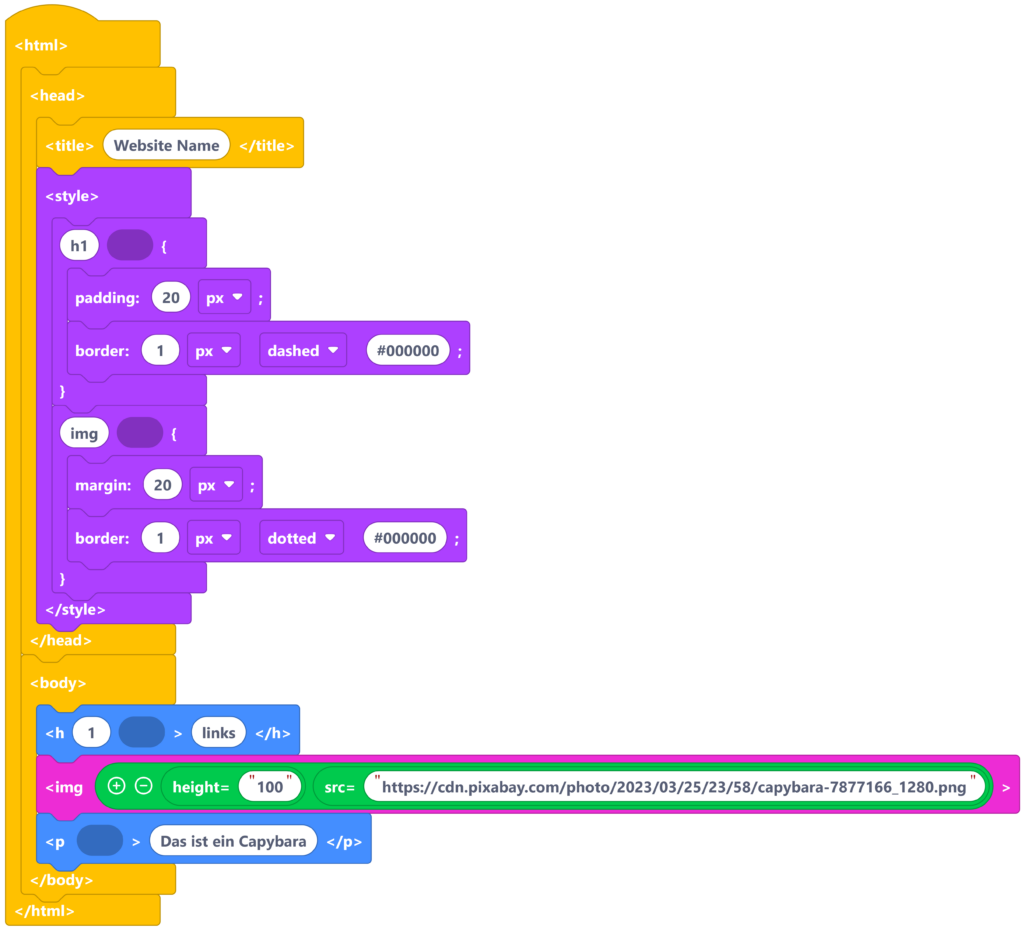 Im obigen Beispiel hat das Capybara einen gepunkteten Rahmen und einen Außenabstand von 20 px.